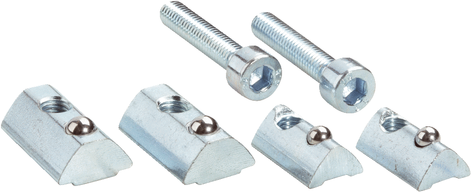 Mounting systems Assembly accessories, BEF-NSIT-PLG Description: Sliding nuts with spring metal ball for ITEM profile, 2x slot 6 and slot 8, including mounting material Items supplied: Mounting hardware included with every 2 x slot 6 and slot 8