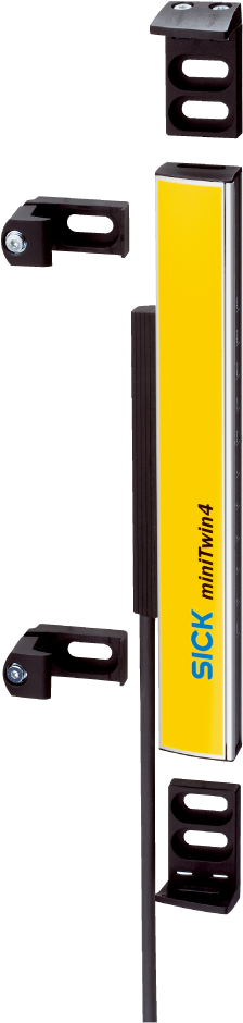 Safety light curtains miniTwin, C4MT-08414ABB03FE0 System part: 1 Twin-Stick Usage: miniTwin4 as a standalone device, miniTwin4 as last guest for 2- or 3-device cascade Mounting system type: C-fix or L-fix bracket Safety level: PL e, SIL 3, Type 4 Resolution: 14 mm Scanning range: 5 m Protective field height: 840 mm Connection type: Male connector M12, 5-pin Enclosure rating: IP65 Items supplied: Twin stick, system plug, C-Fix and L-Fix bracket, 2 pieces each, test rod with diameter corresponding to the resolution of the safety light curtain, safety instruction, Mounting instructions, Operating instructions for download
