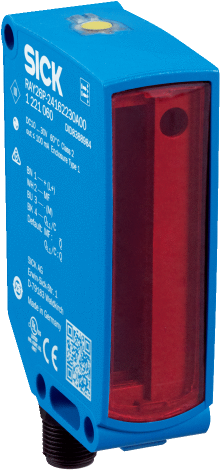 Photoelectric sensors RAY26 Reflex Array, RAY26P-24162330A00 Minimum object size: 3 mm, 5 mm, 10 mm Detection height: 55 mm Sensing range max.: 0 m, 0 m, 0 m ... 2 m, 3 m, 4.5 m Functional principle: Photoelectric retro-reflective sensor Functional principle detail: Without reflector minimum distance (autocollimation/coaxial optics), Reflex Array Switching output: Push-pull: PNP/NPN Switching mode: Light/dark switching Connection type: Male connector M12, 4-pin Light source: PinPoint LED Adjustment: Teach-in button Communication interface: IO-Link