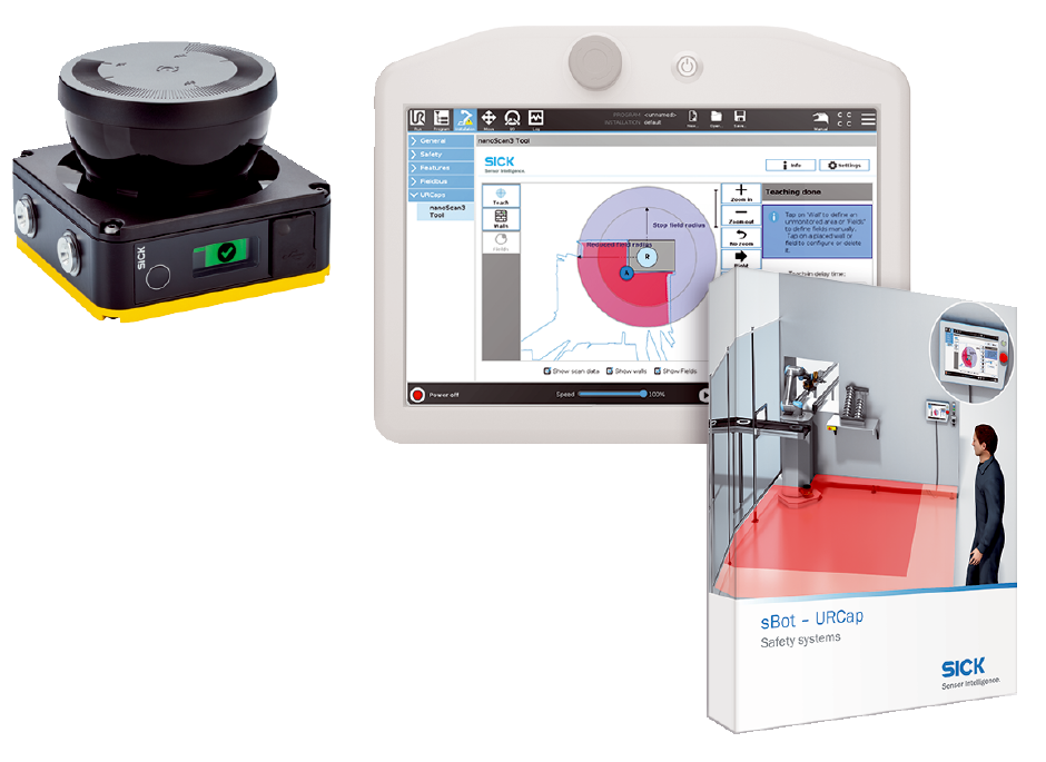 Safety systems Safe Robotics Area Protection, SYS/BOT-URSP4ESUA01NS3 Variant: sBot Speed – URCap Product type: System (hardware and software) Robot controller: Universal Robots: UR3e, UR5e, UR10e, UR16e, UR20 und UR30 Stopping process of the robot: With speed reduction Robot restart: Automatic Interface: Discrete I/Os
