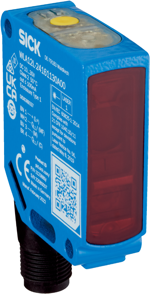 Photoelectric sensors W12, WLA12L-24162230A00 Sensing range min. / max.: 0 m / 11 m Functional principle: Photoelectric retro-reflective sensor Functional principle detail: Without reflector minimum distance (autocollimation/coaxial optics) Switching output: Push-pull: PNP/NPN Switching mode: Light/dark switching Connection type: Male connector M12, 4-pin Light source: Laser Type of light: Visible red light Laser class: 1 Housing material: Zinc diecast Adjustment: Teach-in button, cable Communication interface: IO-Link V1.1 Smart Sensor: Enhanced Sensing, efficient communication, diagnosis, Smart Task Smart Task name: Base logics Housing: Rectangular Focus position: 150 mm
