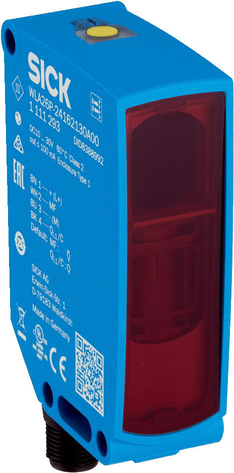 Photoelectric sensors W26, WLA26P-24162130A00 Sensing range min. / max.: 0 m / 18 m Functional principle: Photoelectric retro-reflective sensor Functional principle detail: Without reflector minimum distance (autocollimation/coaxial optics) Switching output: Push-pull: PNP/NPN Switching mode: Light/dark switching Connection type: Male connector M12, 4-pin Light source: PinPoint LED Type of light: Visible red light Housing material: VISTAL® Adjustment: Teach-in button, cable Communication interface: IO-Link V1.1 Smart Sensor: Enhanced Sensing, efficient communication, diagnosis, Smart Task Smart Task name: Base logics Special features: Factory setting: Switch-off delay, 70 ms, differs from the IODD (document no. 8021088) Housing: Rectangular