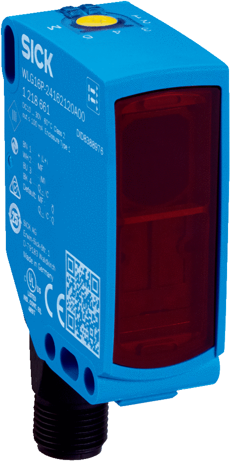 Photoelectric sensors W16, WLG16P-2416H120A71 Sensing range min. / max.: 0 m / 5 m Functional principle: Photoelectric retro-reflective sensor Functional principle detail: Without reflector minimum distance (autocollimation/coaxial optics), ClearSens Switching output: Push-pull: PNP/NPN Connection type: Male connector M12, 4-pin Light source: PinPoint LED Type of light: Visible red light Housing material: VISTAL® Adjustment: Teach-in button, cable, Potentiometer, Teach-Turn adjustment Communication interface: IO-Link V1.1 Smart Sensor: Enhanced Sensing, efficient communication, diagnosis, Smart Task Smart Task name: Counter + debouncing Housing: Rectangular